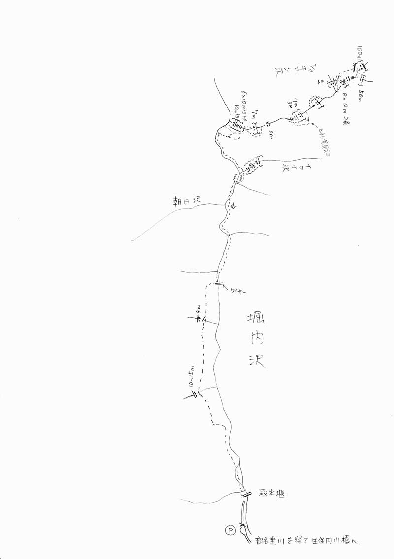 | 行程 | →:山道・踏跡、→:溯行・下降、→:藪漕ぎ、=:車 【7月14日】 曇のち雨 さいたま7:35=13:15盛岡イオン14:30=16:50堀内沢取水堰手前林道終点(車中泊) 【7月15日】 雨時々曇 林道終点5:10→→盗伐林道5:35→6:23堀内沢ワイヤー6:40→朝日沢出合7:30→イワイ沢8:03→→8:45シャチアシ沢出合滝上9:05→9:09 7m滝9:21→→3m・4m連瀑9:44→→10:15前衛滝10:30→10:50ヒネリ滝11:45→前衛滝12:00→→13:00シャチアシ沢出合下13:10→イワイ沢13:40→朝日沢出合14:02→14:50堀内沢ワイヤー15:10→→16:15林道終点16:40=17:55田沢湖YH(泊) |