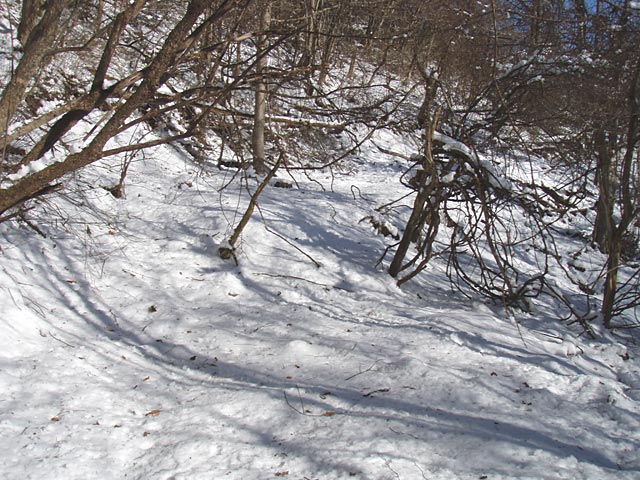 | 記録 | '02年12月に、笹を覆う新雪に、1330M反射板の先で、断念・敗退した「和名倉山二瀬尾根1400M敗退」。その後、'03年11月に、雪の無い時季を狙って、二瀬尾根からリベンジを果たした。今回、前々日にかなり雪が降ったのを覚悟の上で、二瀬尾根にチャレンジしてみた。 【1月8日】 快晴のち曇 二瀬尾根の出発点である、埼大山寮近くの駐車スペースに車を停める。スペースは雪で覆われており、都会仕様のマイカーでは、乗り入れにちと不安を感じる。何とか上手く駐車し、身支度して出発だ。今回は、デジ一眼・三脚などは省略し、コンデジ:Olympus μ725SW で軽量化を図る。アイゼン・ピッケルを担ぐが、出来れば使わずに済ませたいところだ。 埼大山寮の下を通って、雪に覆われた道を歩き、秩父湖に懸かる吊橋へと向かう。吊橋の板の上には、氷化した雪が覆っている。吊橋から見上げると、噂通り、1330M反射板の姿が、見えないようだ。やはり、撤去されたのであろうか。対岸に渡り、枯葉に覆われた、バンド状をトラバースする所が、少し悪い。薄暗い、杉林の中を登って行く道に入る。一旦、尾根上に乗って、秩父湖を見下ろしながら、上着を一枚脱ぐ。 再び、杉林の斜面に入り、しばらくジグザグ登りを続ける。いい加減飽きた頃、再び尾根上の道になる。左手は杉林、右手は落葉樹林だ。杉林には、雪があまり積もらないが、落葉樹林には、結構積雪がある。登るにつれ、次第に雪が深くなる。落葉樹林帯をトラバースし、笹藪斜面の切り開きを登ると、1330M反射板跡に飛び出す。 噂通り、反射板は撤去され、跡地には松の苗木が植えられていた。ここは、二瀬道では、数少ない展望台なので、パンを囓りながら休憩しよう。小休後、1350M水平道に入るとすぐ、左手に平坦地形が目に入る。この辺りで、既に木々の合間から、尾根上に新反射板が見えるではないか。 少し行くと、東大演習林の「バス停」が、石津窪左岸道の分岐の目印になっている。枝の合間から、新反射板が、確かに見えている。分岐を過ぎて、なおも進んで行くと、次第に道が荒れて来る。1330M反射板跡から30分弱で、山ノ神尾根に至る。登り側は、マーキングしてあり、踏跡もあるようだ。下り側も、マーキングがある。一度、偵察しておきたいものだ。 山ノ神尾根から5-6分で、索道残骸尾根に至る。ここからの索道残骸尾根の下降は、何度か踏査済みである。登りの方は、踏跡と言うより、獣道のようだが、帰りに余裕があれば、ここから新反射板まで、登ってみよう。さらに水平道を辿ると、索道尾根から20分弱で、小屋跡に至る。いつも不快な思いをする小屋跡も、ガラクタやゴミの類が雪に埋もれ、比較的気分良く通過する。 上段道(1350M水平道)が水場の沢を横断する場所に、白い道標プレートがあった。水平道は、水場の沢を横断して更に続き、和名倉沢1380M右岸枝沢出合付近まで、踏跡を辿ることが出来る(MR539)。今回は、水平道の延長を横目に、水場の沢沿いに、ゴーロ状を少し登れば、水場に至る。水量は、意外に豊富であった。 ここからは、無雪期は苔生したゴーロ状となる、浅い沢形の左側沿いに、登って行く。笹藪廊下取付地点まで、意外と登らされる。次第に急になる泥斜面も、軟雪が被っている。笹藪が始まり、傾斜のある涸れ窪状の笹トンネルを登って行く。 傾斜が少し緩むと、沢状地形の左手の小尾根状に乗り、次第に激藪状態となる。無雪期には、踏跡を忠実に辿れば、迷うことは少ないのだが、中途半端に雪を被った笹は、不規則に倒れ、踏跡を覆い隠してしまう。ここで踏跡を外すと、激藪を延々漕ぐことになるので、帰りのために、赤ビニテを付けて行こう。最後の辺りは、従来の踏跡ではなく、1684Pを忠実に尾根伝いに進むコースに、付け替えられているような印象だった。 コルの平坦地から先は、いい感じに雪が積もっており、快適な冬の尾根歩きが楽しめそうだが、時刻は既に11時半。先ずは、ザックを下ろして、休憩しよう。積雪は、膝下程度であるが、登るにつれ深くなって来るであろうし、これからの山頂往復には、ちと無理がある。引き返しを決断する。 笹藪廊下も、トレースを着けて来たので、帰りは楽であろう。再びザックを背負い、歩き出す。笹を被った雪も、叩き落として来たので、藪漕ぎがかなり楽になっている。下りになると、かなりスピーディに進んで行く。無雪期とさほど変わらぬ感じで、笹藪廊下を通過してしまう。 笹藪廊下を抜け、その下の泥斜面からは、霧藻ヶ峰や長沢背稜方面が望まれる。やはり、下りは楽だ。1650Mコルから40分で、水場を通過する。小屋跡から1350M水平道(上段道)を辿り、索道残骸尾根に至る。ここから、尾根上部にある新反射板を偵察してみよう。 往きに確認して置いた、獣道入口に踏み込む。しばらくは、幅広尾根の樹林帯で、藪は薄かったが、やがて笹藪倒木帯に突入する。これを突破して、山ノ神尾根と尾根が合わさった辺りの樹林帯に入る。