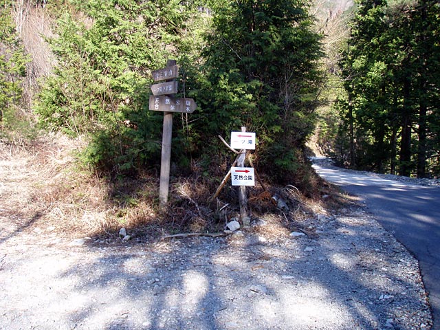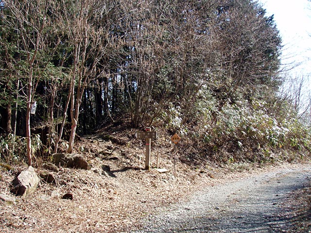 川上登山道丸野林道出合(夕森田立林道・吊橋下降点)に出る |