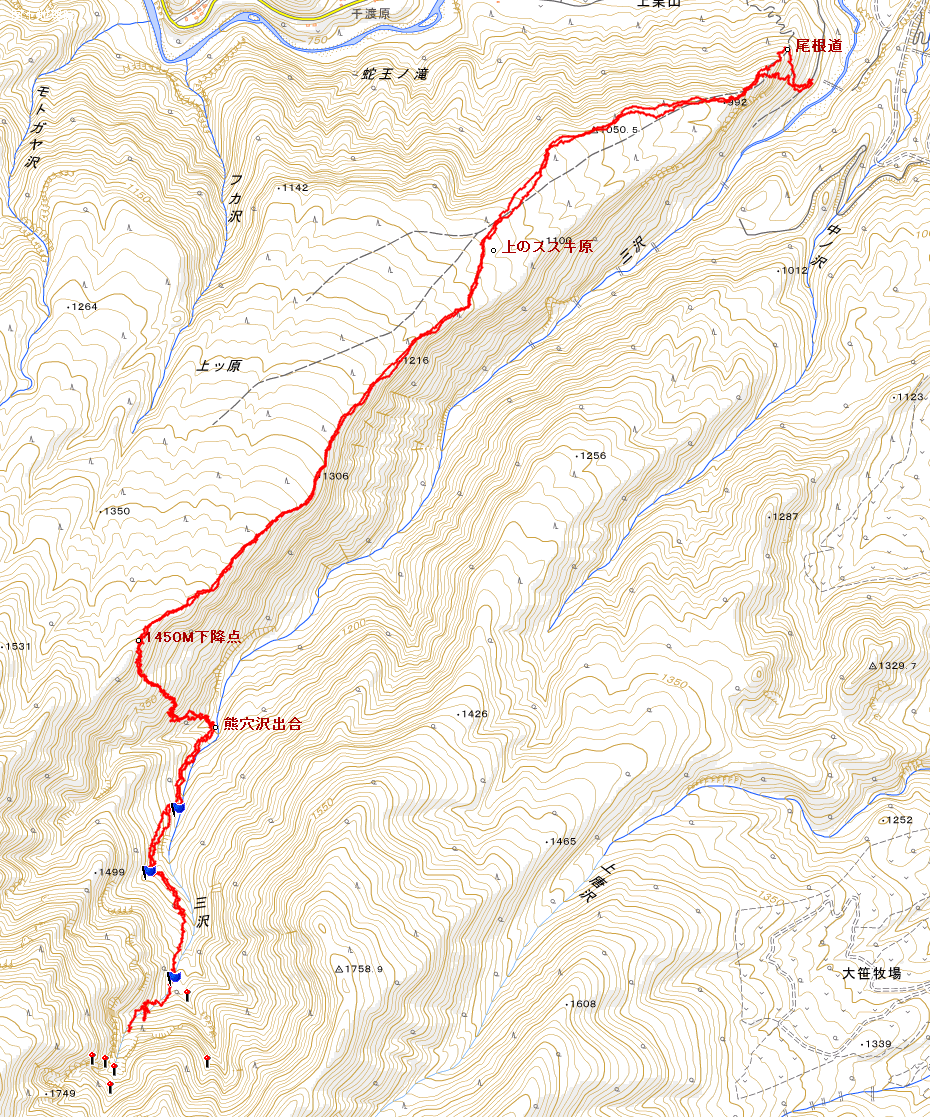 | コース | 上栗山〜上ッ原〜1450M下降点〜熊穴沢出合〜三沢双竜滝(往復) |
