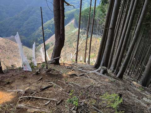 石津窪山の南尾根700M付近まで下ると 尾根東面の伐採跡植林斜面では 草刈り機がうなりを上げていた |